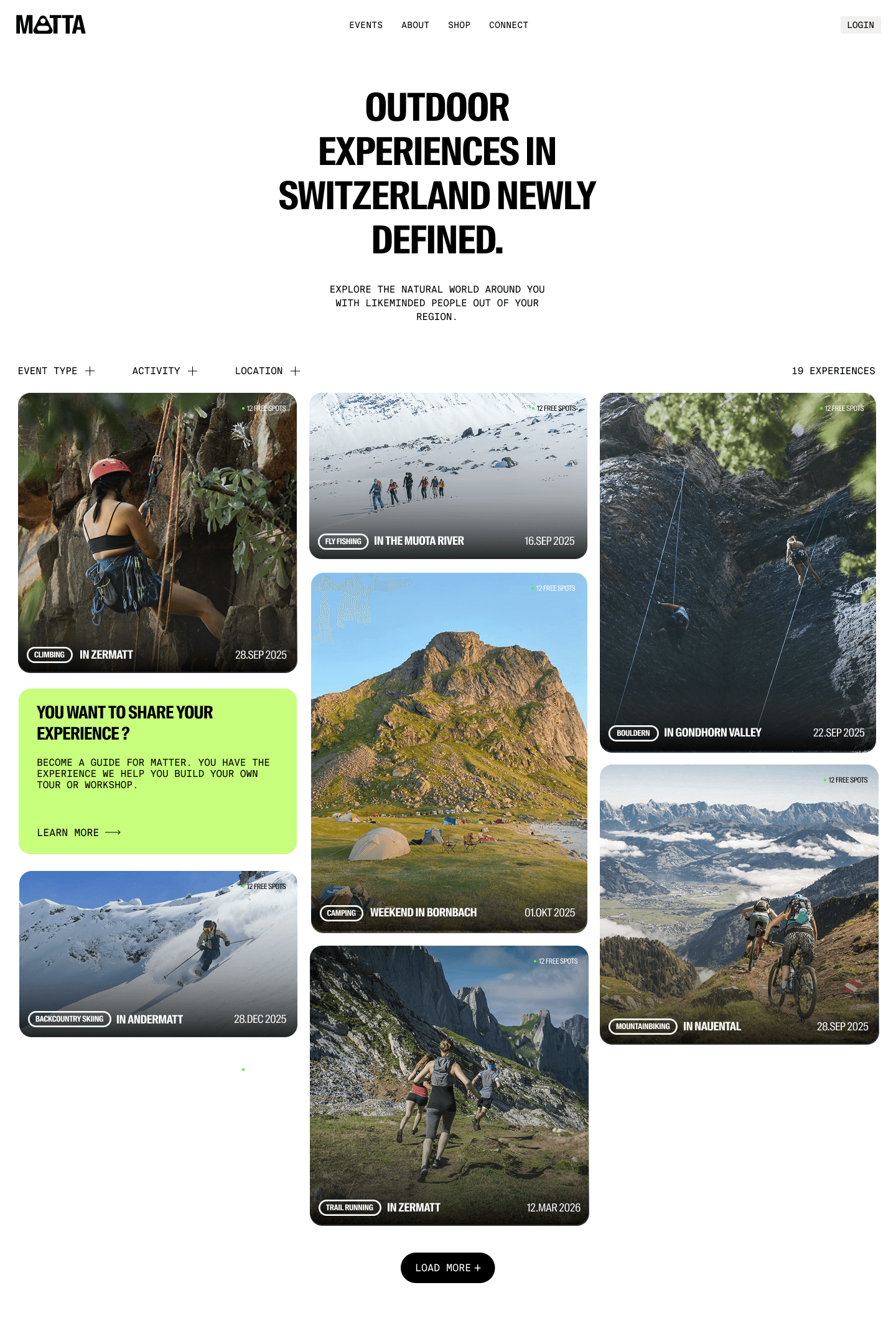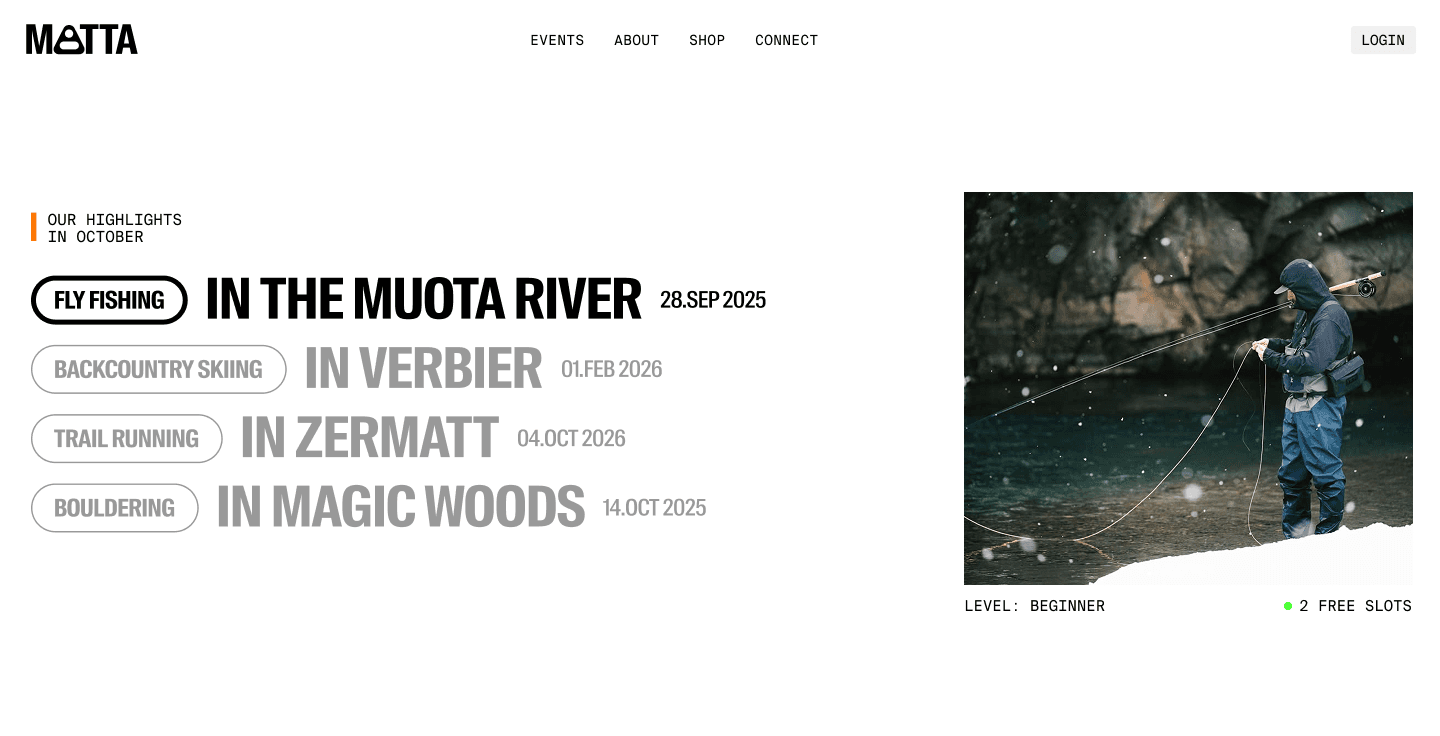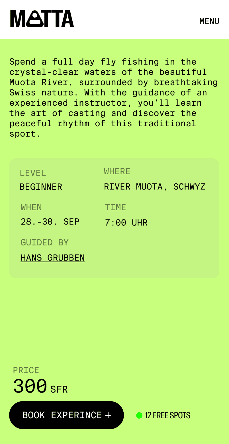 MATTA is a self-initiated digital concept, designed to redefine how locals and travelers engage with the outdoors. Moving away from dated, fragmented booking platforms, MATTA offers a curated ecosystem of high-end outdoor experiences—from fly fishing over bouldering to herb-picking. The platform combines a minimalist, editorial aesthetic with a seamless functional core.