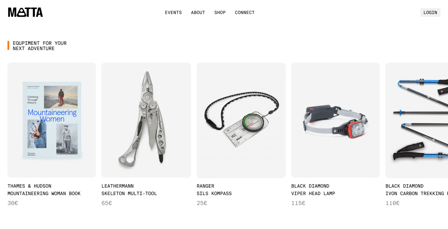 To add value to the user and create additional revenue streams for the brand, I designed an integrated e-commerce layer. Users don't just book a climbing trip; they are presented with the specific equipment needed for that terrain—ranging from technical multi-tools to MATTA-branded apparel. This creates a cohesive brand universe where the digital platform prepares the user for the physical world.